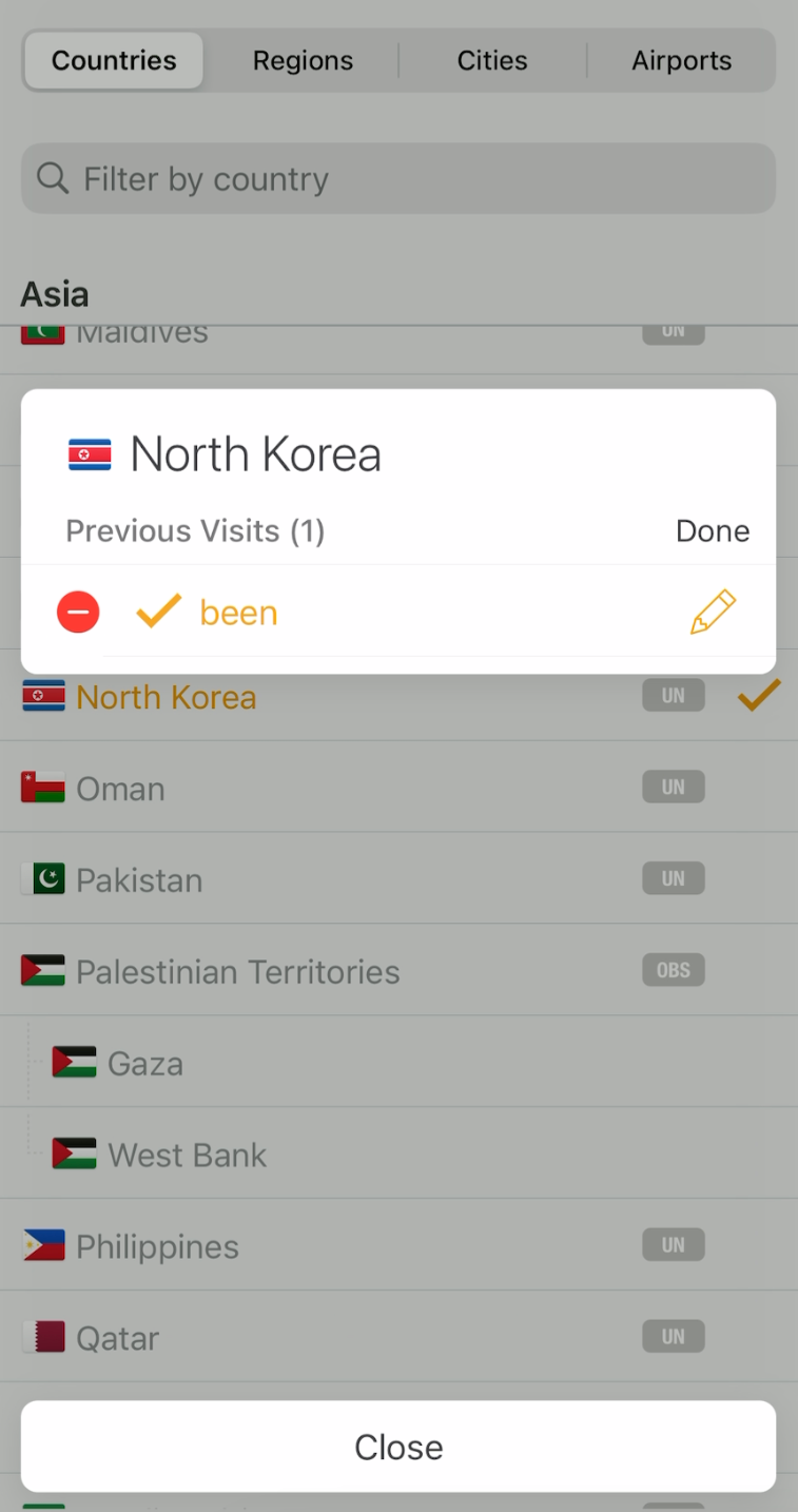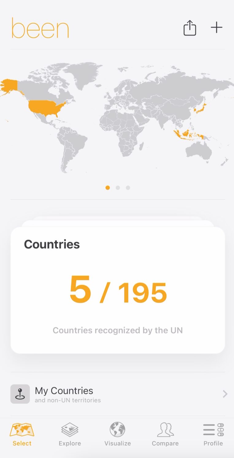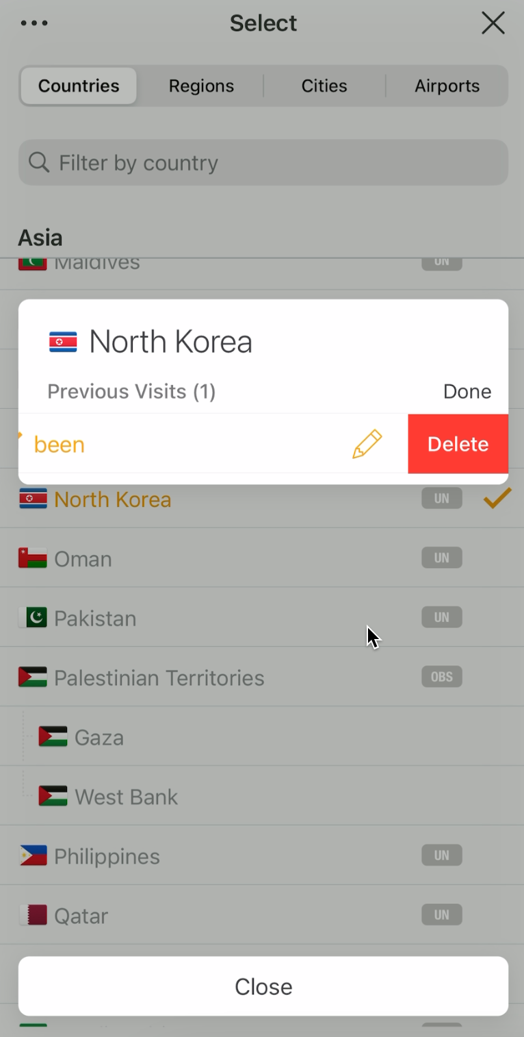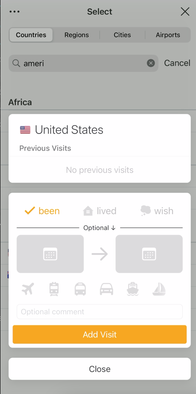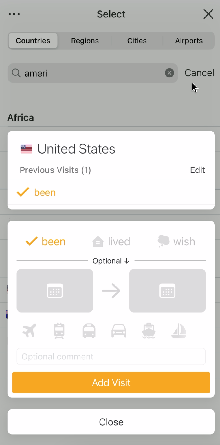 ↓では「United States(アメリカ合衆国)」を選択 & 追加しています。右のように「Previous Visit」に「✓ been」が追加されていればOK👌