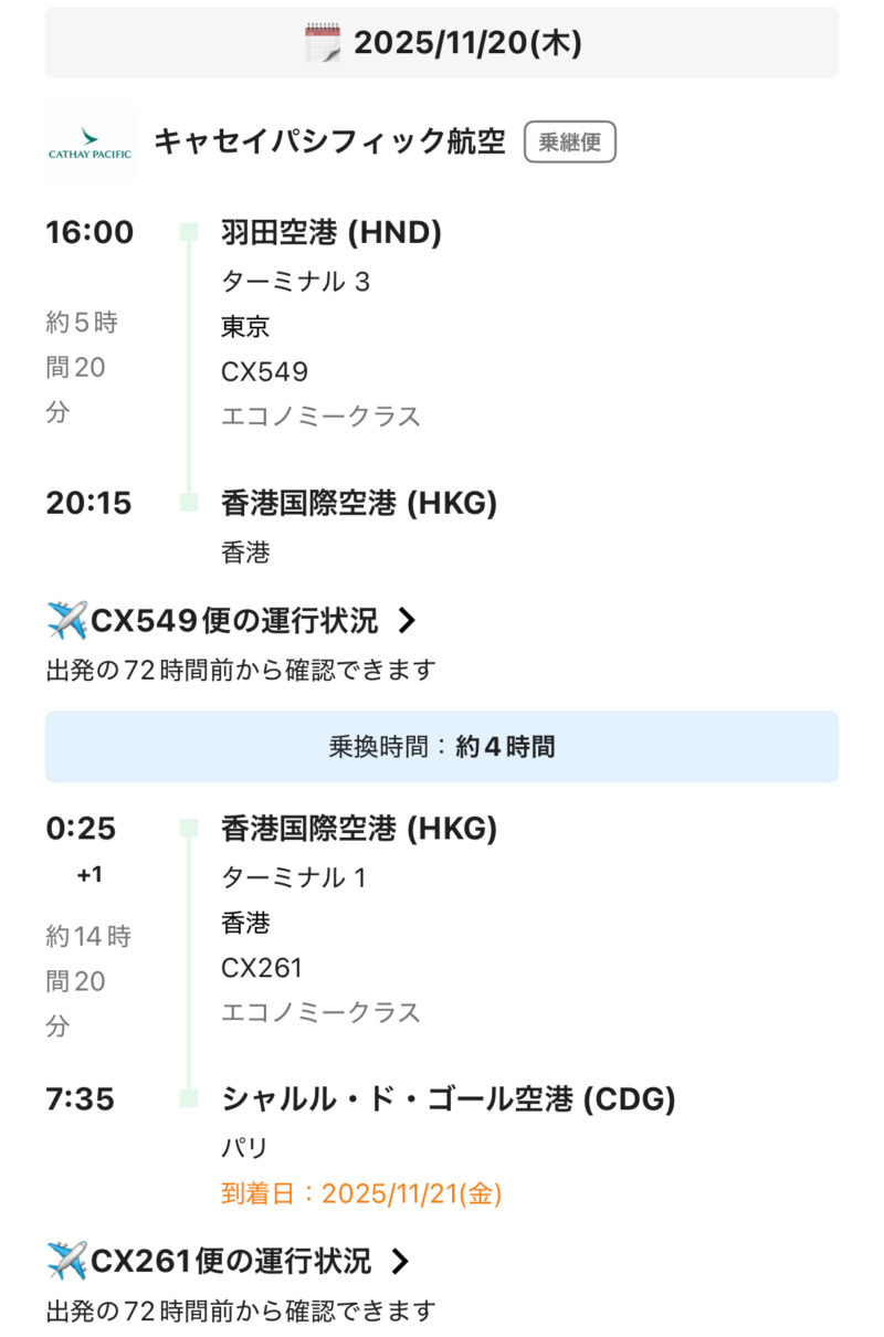 上記の理由から、香港乗り継ぎは海外初心者の方にもとてもおすすめです👌(中東乗り継ぎだと、時差もあっていつ寝たらちょうどよくなるかわからなくなるw)