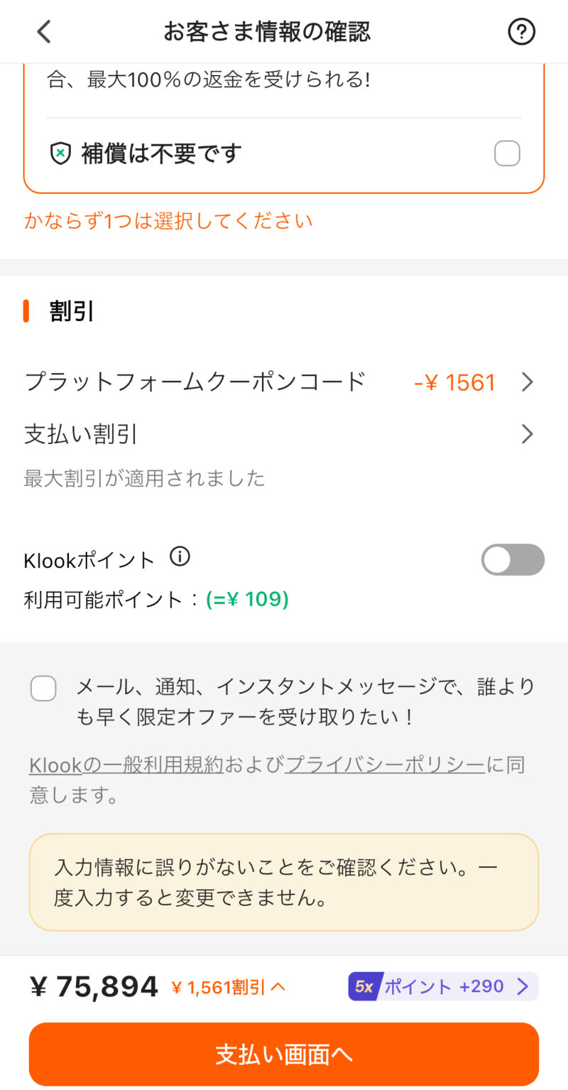 Klookはさまざまなクーポンがあるので、複数回に購入をわけても何かしらクーポン使えることが多々!! 少し面倒ですが、複数回にわけて購入をおすすめします💡